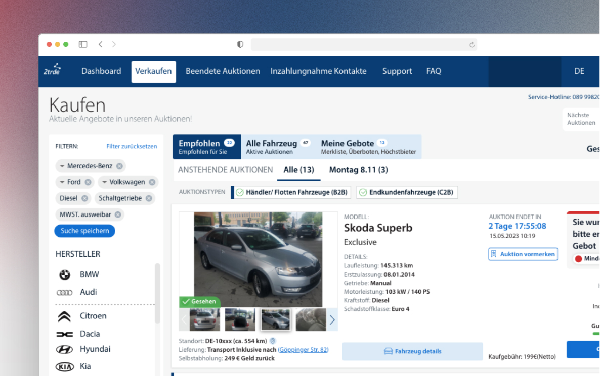 Transparente Fahrzeug- und Zustandsdaten, Schadensberichte, smarte Filter, Android/iOS App, automatischer Bietagent und eine breite Markenvielfalt sorgen für maximale Übersicht, Geschwindigkeit und Sicherheit beim Einkauf.Jetzt registrieren